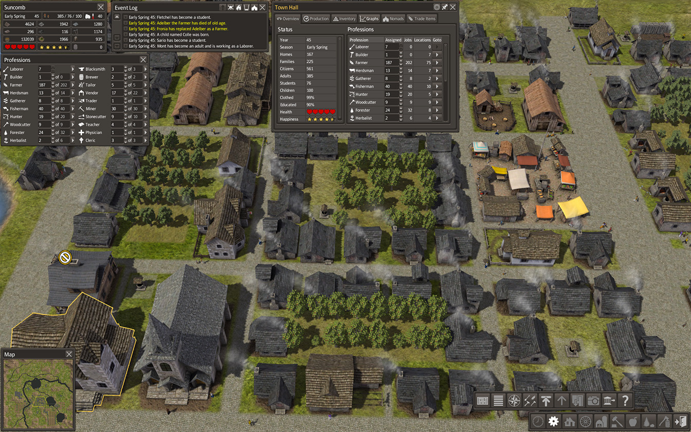 • В игре есть 18 различных ремёсел для населения вашего города: начиная с фермером и охотников, заканчивая кузнецами, учителями и целителями. В игре не будет универсальной стратегии - объём ресурсов на картах будет отличаться. Игрок может высаживать леса заново, строить шахты для добычи железа и карьеры для добычи камня, но подобная тактика будет означать уменьшение драгоценного места, необходимого для экспансии;