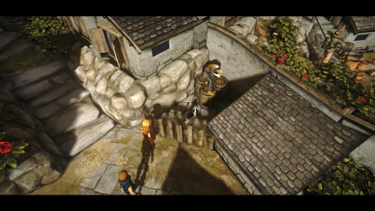 Выходим из дома и спускаемся вниз. Хулиган не дает пройти, поэтому идем еще ниже к речке. Младший брат не умеет плавать, поэтому цепляемся за спину старшего брата, удерживая нажатой соответствующую кнопку. Проплываем под мостом и взбираемся наверх по веткам на берегу. Переходим на другую сторону и лезем по камням. Ухватившись за один из них, удерживаем нажатой кнопку движения вперед, отпускаем кнопку действия и снова удерживаем ее нажатой после прыжка. Проходим к выступу и, сместившись влево, обходим забор. Учимся вращать камеру и идем дальше, взобравшись на большие емкости. Залезаем по сетке и по одному проходим по узкой крыше арки. Спустившись, младшим братом протискиваемся между прутьями решетки с левой стороны. Вращаем механизм и выпускаем собаку из клетки. Добираемся до подъемного моста и будим стражника младшим братом. Затем показываем рукопись старшим братом и покидаем деревню.