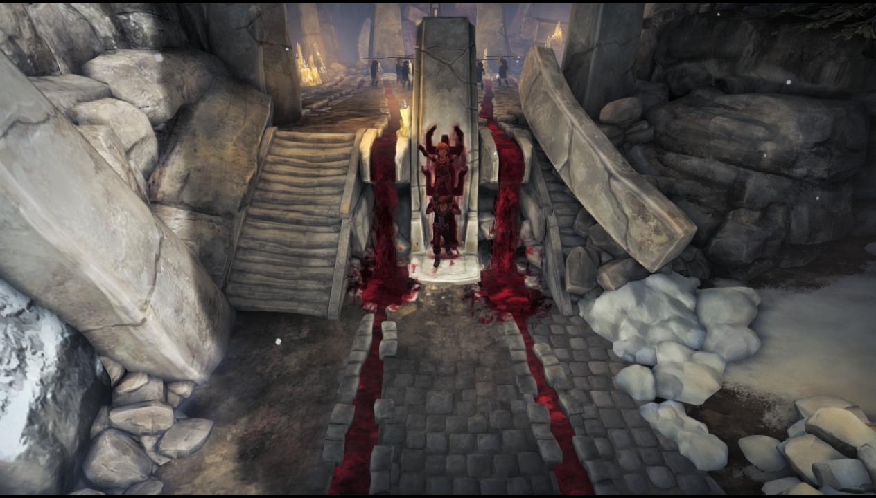 Добравшись до преграды в виде руки воина, хватаемся за стрелу и передвигаем вперед. Спустившись по водостоку, быстро цепляемся за спину старшего брата. Доплыв до берега, подбрасываем младшего брата с правой стороны. Управляя им, подпрыгиваем к ветке и смещаемся влево до тех пор, пока старший брат также не сможет зацепиться. Пройдя дальше, вместе залезаем на возвышенность и синхронно запрыгиваем на стрелу. Спускаемся вниз по воде и поднимаемся наверх с правой стороны. Переходим по копью, хватаемся за стрелу и долго и упорно толкаем ее вперед. Добравшись до следующего воина, сворачиваем налево, переходим по ветке и поднимаемся повыше. Обходим скалу сбоку (при необходимости вращаем камеру), оттягиваем стрелу назад и производим выстрел. Возвращаемся назад и проходим дальше.