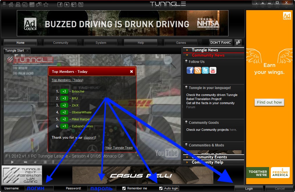 6. Запускаем программу Tunngle на своем компьютере и вводим свой логин и пароль: