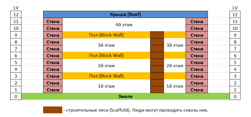 4. Переходим на lv4. Уже на нем мы можем размещать зоны и предметы. Строим два уровня стен по периметру (lv4-lv5), не забываем достраивать колонну из лесов.